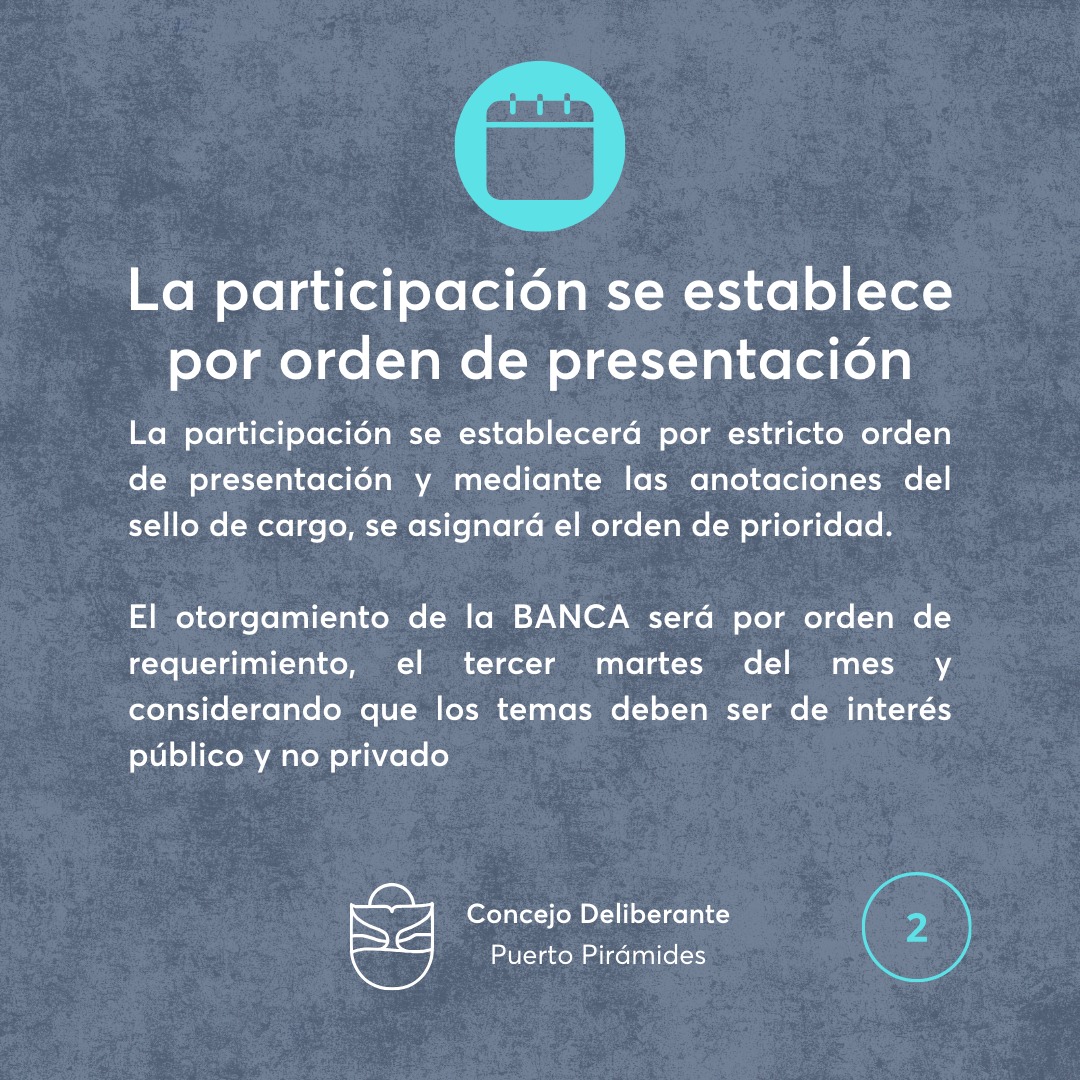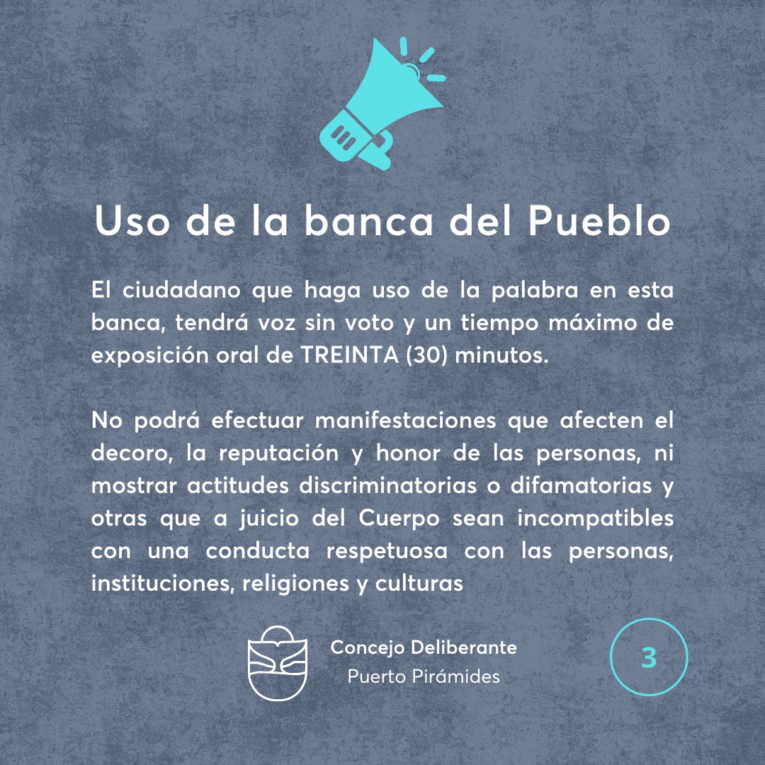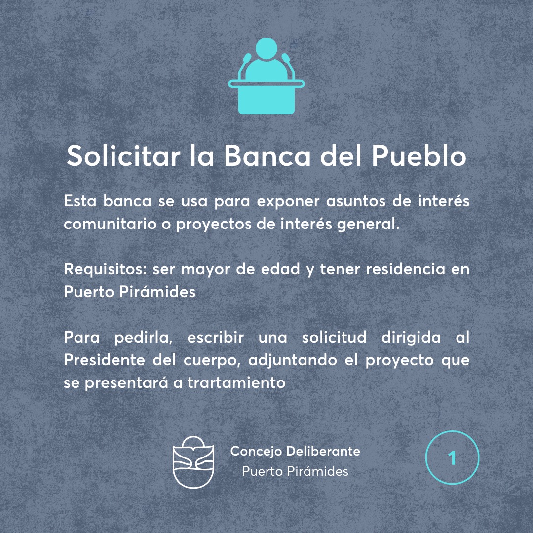La Banca del Pueblo es un espacio de participación ciudadana que permite a los vecinos y vecinas de Puerto Pirámides presentar proyectos o plantear temas de interés comunitario ante el Concejo Deliberante.